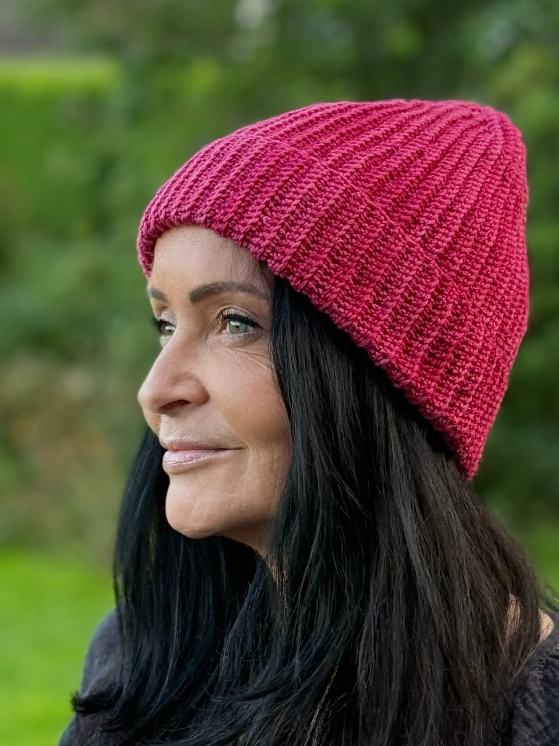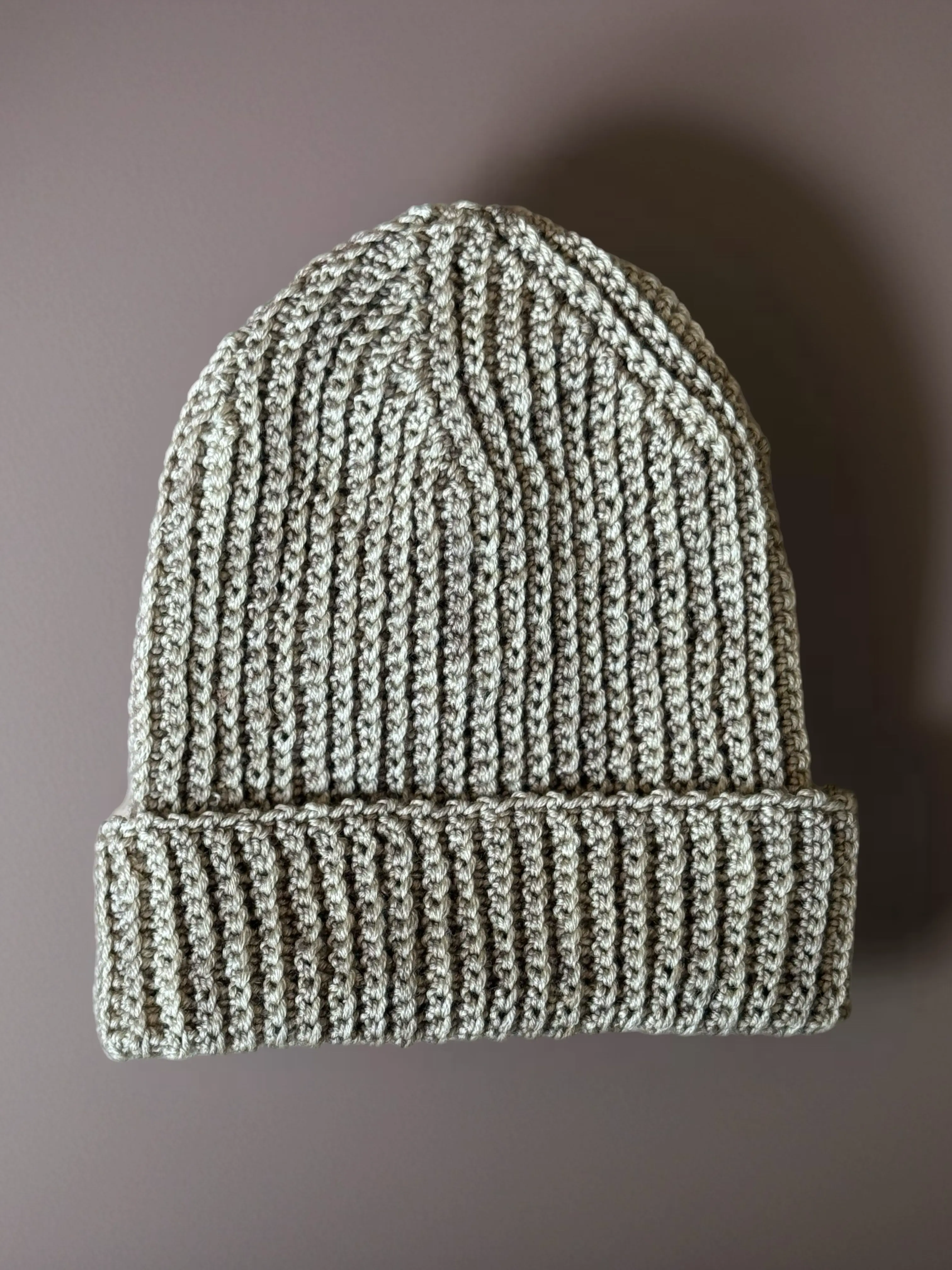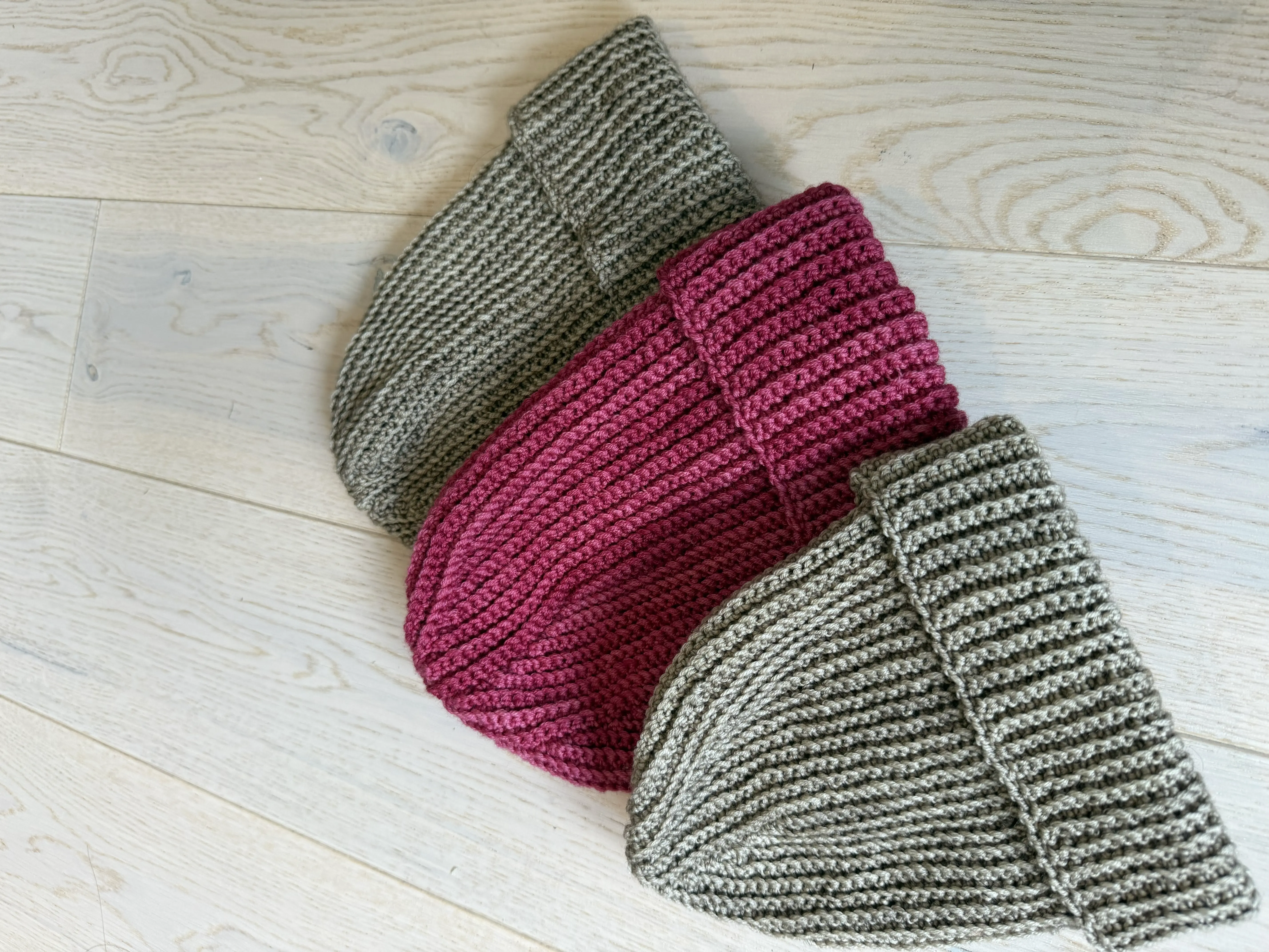 Mathilde-luen er en klassisk ribbelue heklet i fastmasker i bakre ledd. Enkel å hekle, elastisk passform og tidløs look med oppbrett. Last ned oppskriften i PDF her.