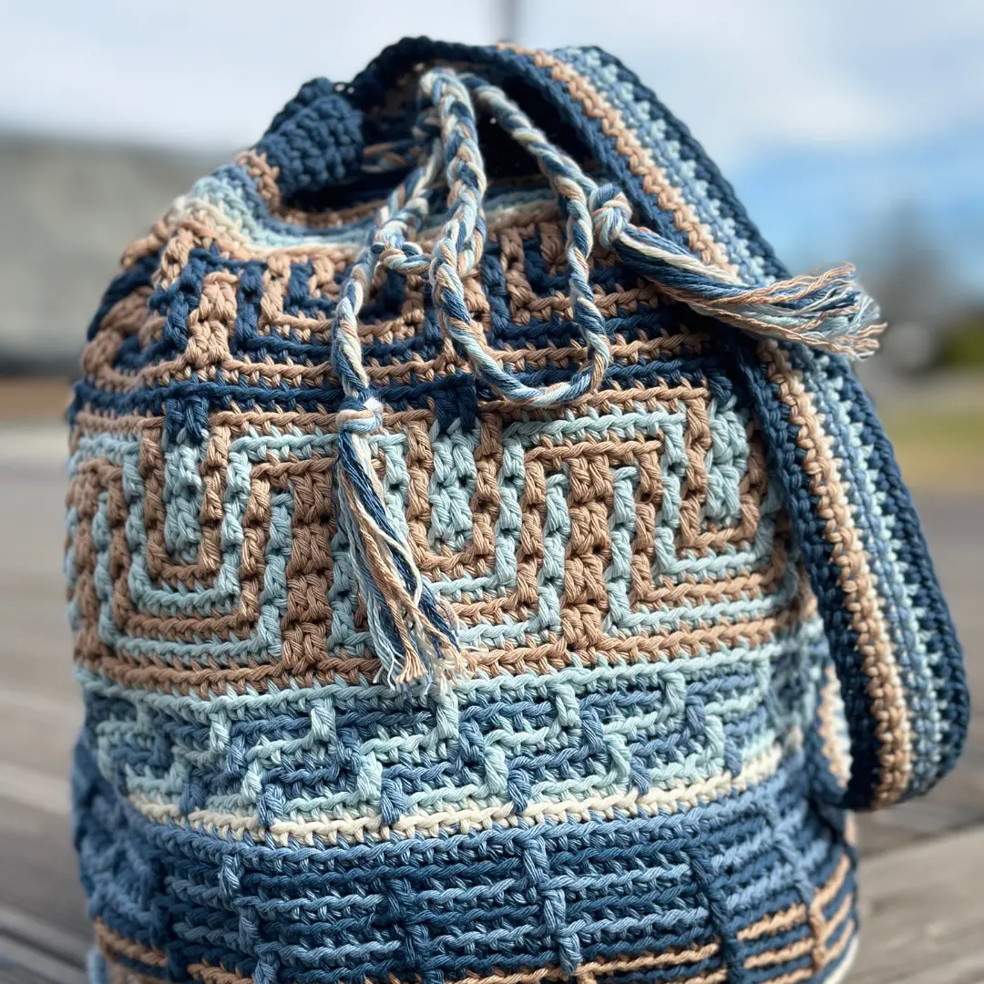 - Fortsett vesken: Når mosaikkdelen er ferdig, fortsett med den originale oppskriften – lag stropp, fest den til vesken, og hekle snor til lukking